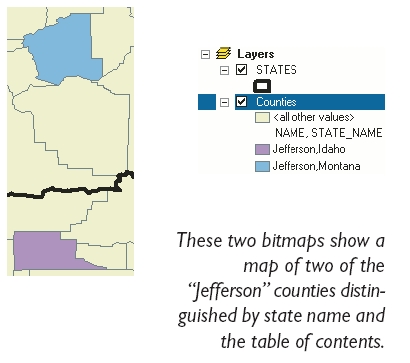 Specifying more than one field is valuable when a feature is ambiguous in the categories defined by just one field. For example, in the United States "Jefferson" is a common county name. If you are making a map of the counties of the United States, you might choose to define your unique values symbolization based on two fields: county name and state name.