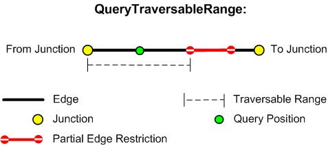 If a queried edge element is not completely restricted (as indicated by the INetworkForwardStarEx::get_IsRestricted method), then it may still have partial edge restrictions associated with it. The QueryTraversableRange method may be used to determine the appropriate range of accessibility along that edge from a given query position.