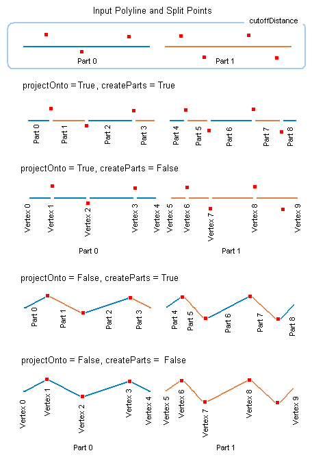 createParts: The createParts is an input parameter that determines if parts (paths) have to be created. createPart must be FALSE for polygons. For polylines, if createPart is TRUE, the part on which the new split point falls is split into two parts with the newly added vertex serving as the end of the first part and the beginning of the second.