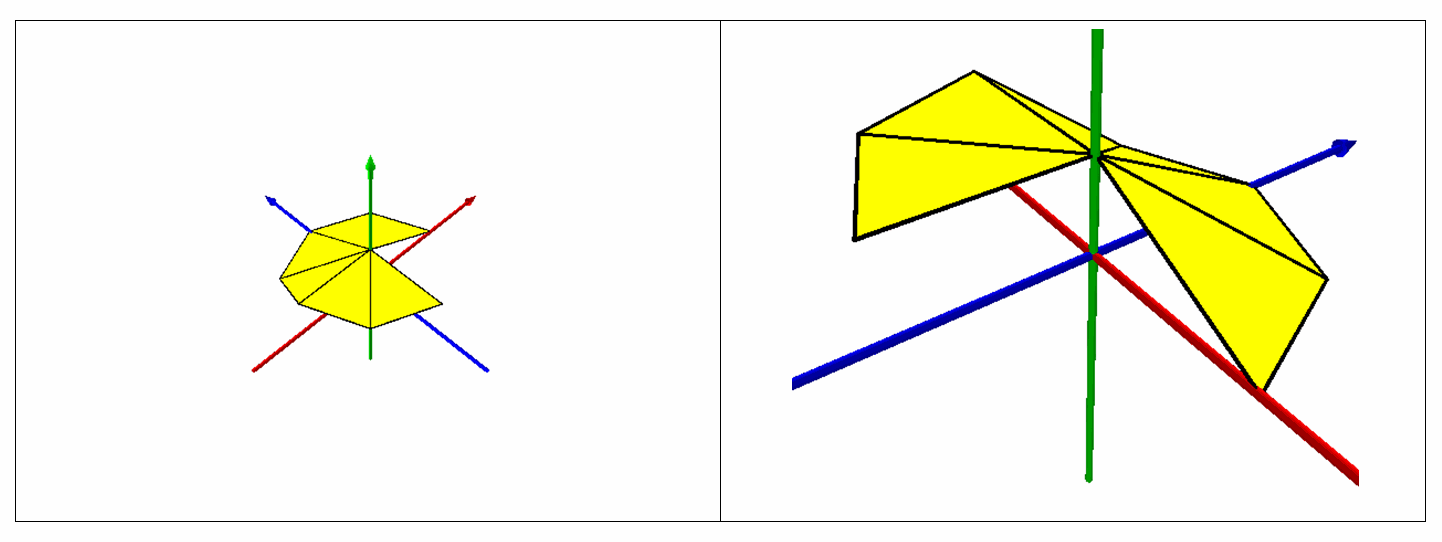 A continuous 3D fan of triangles, where each triangle after the first shares an edge with the preceding triangle, and all triangles share a common pivot point.